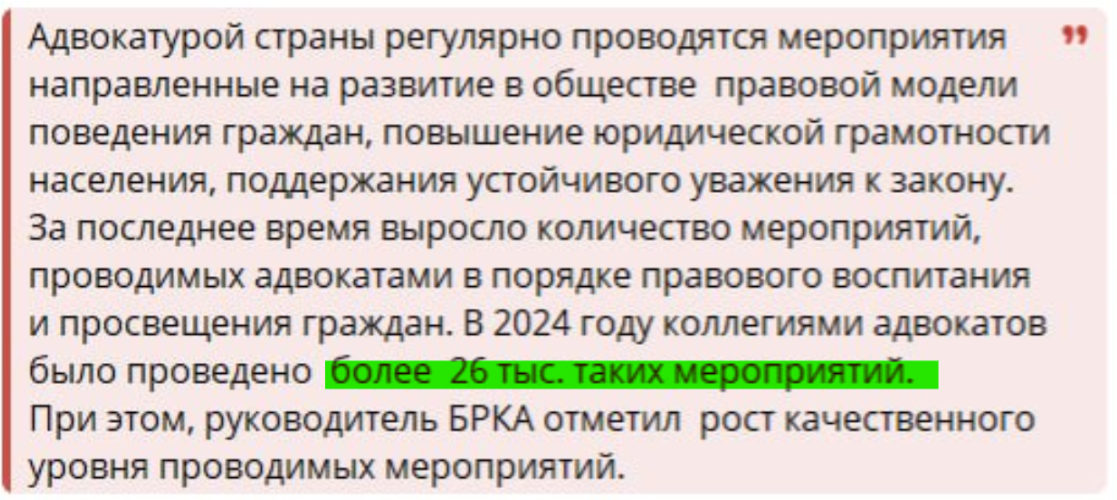 “The country’s bar associations regularly conduct activities aimed at promoting a legal culture among citizens, improving legal literacy, and fostering stable respect for the law. Recently, the number of such activities carried out by lawyers in the context of legal education and public awareness has grown significantly. In 2024 alone, the bar associations conducted more than 26,000 such events.