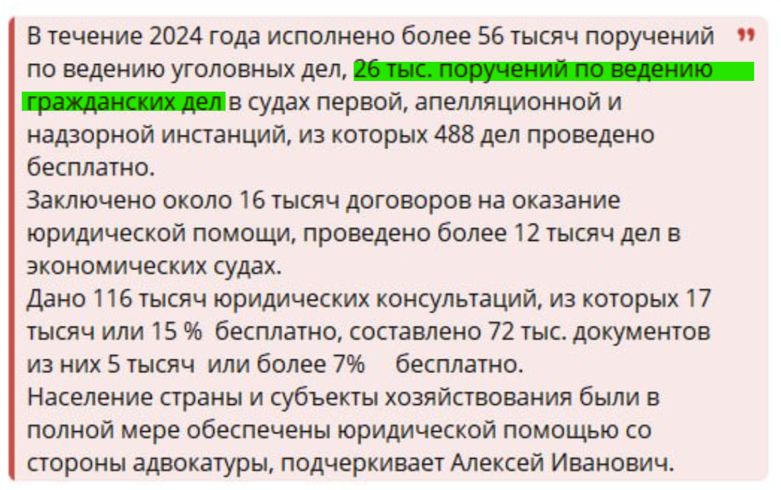 “In 2024, more than 56,000 assignments were carried out for criminal cases, and 26,000 assignments for handling civil cases in courts of first instance, appellate, and supervisory levels, of which 488 cases were handled free of charge. Approximately 16,000 contracts were signed for the provision of legal assistance, and more than 12,000 cases were handled in economic courts. A total of 116,000 legal consultations were provided, 17,000 of which — or 15% — were offered free of charge. 72,000 legal documents were drafted, of which 5,000 — or more than 7% — were prepared free of charge.